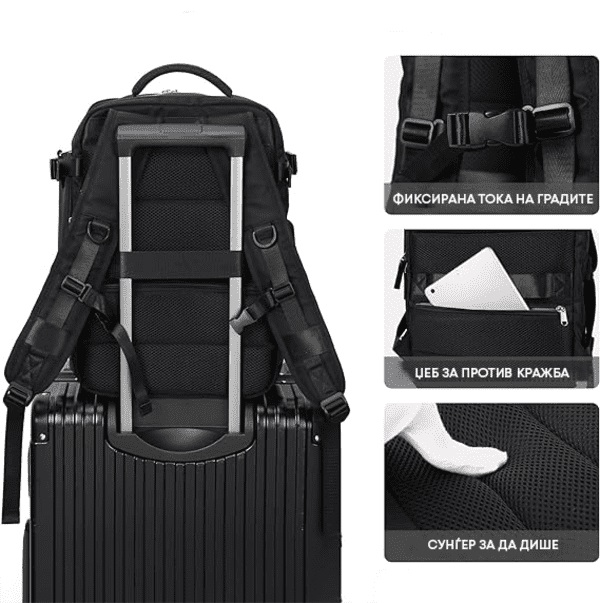 Удобно за носење – Ергономскиот дизајн со прилагодливи ленти за рамо и вентилиран грб обезбедува удобност при долго носење, што го прави овој ранец идеален за патување и секојдневни активности.