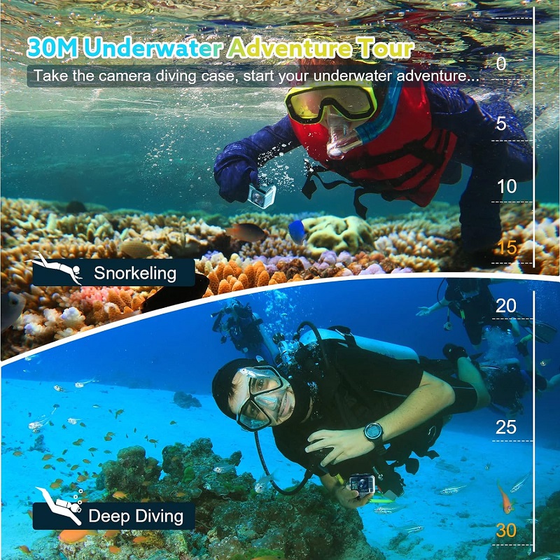 Акциона камера која ќе биде вашиот најдобар партнер за снимање. Видео камера 4K / 30 fps доаѓа со 2 батерии и 1 приклучок за полнење, по целосно полнење поддржува 4 часа континуирано снимање. Објективот од 170 степени има дизајн на рибино око за гледање на широко поле од 360 степени со ротирачки држач. И погодно за различни прилики, снимање со повеќе агли. И 30M подводното снимање ги задоволува барањата за подводно снимање за љубителите на нуркањето. Дополнително, вградениот фотосензитивен елемент со низок шум од 1/2 инчи може да снима шарени и ултра јасни слики.